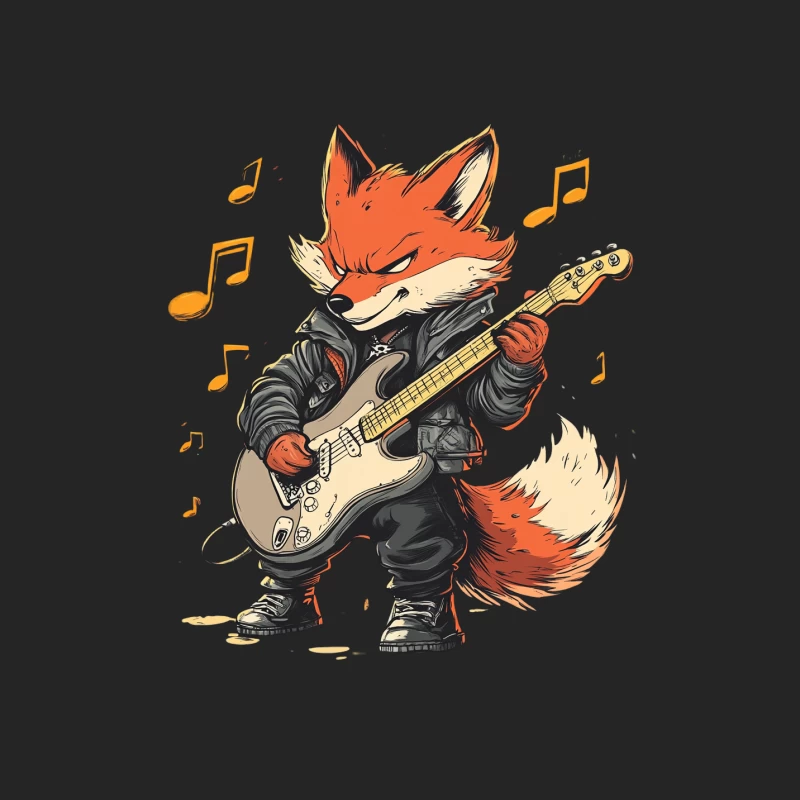 electric guitar cartoon fox animal character rock musician music notes leather jacket
