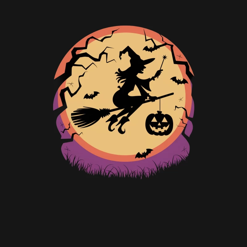silhouette witch pumpkin broomstick Halloween bats moon