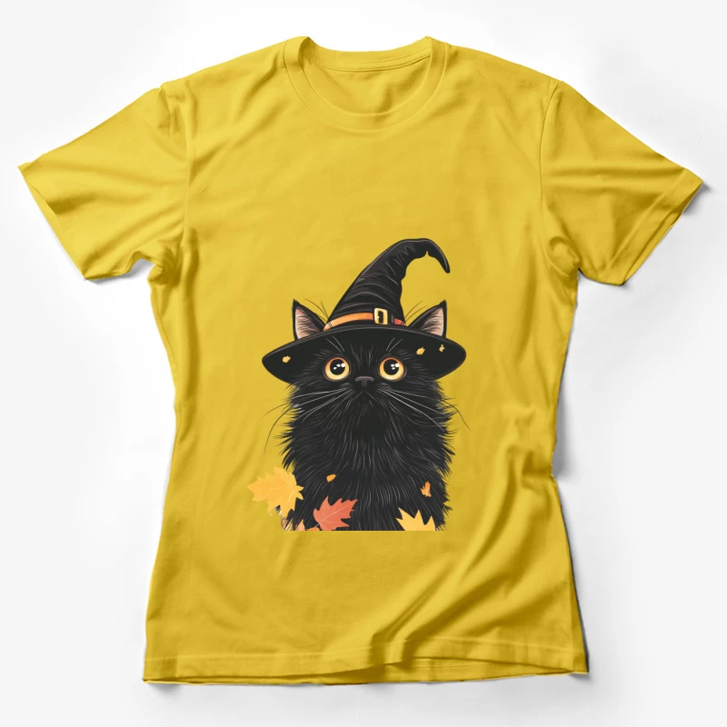 Adorable Halloween Black Cat with Witch Hat and Autumn Leaves Female T-Shirt