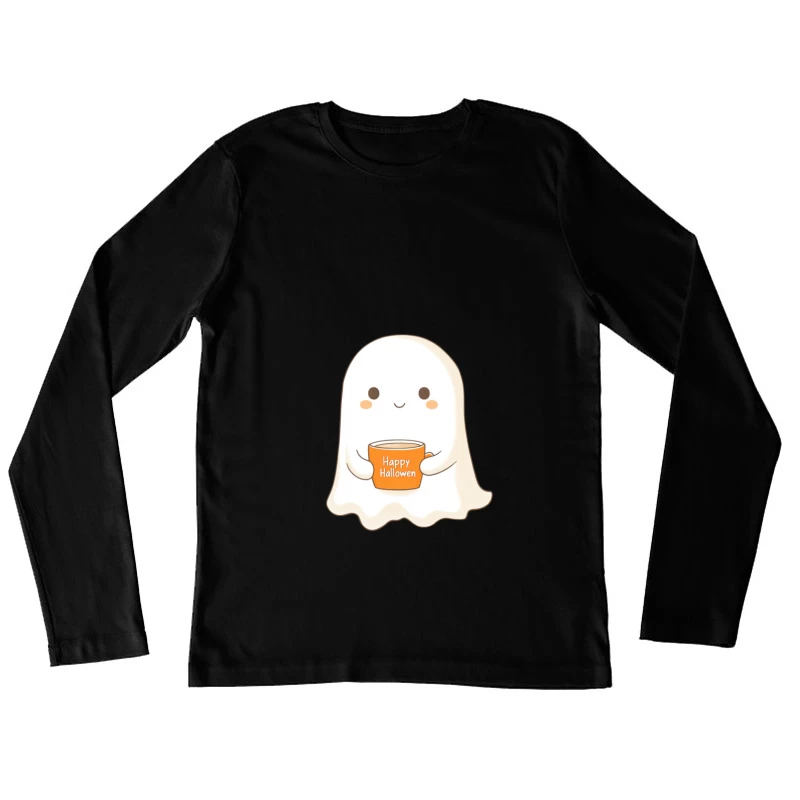 Cute Cartoon Ghost Holding Coffee Cup for Happy Halloween Greeting Female Long Sleeve T-Shirt