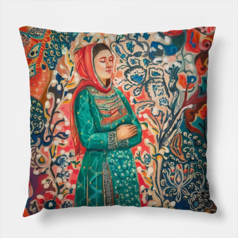 Vibrant Folk Art Painting of Woman in Traditional Costume Surrounded by Colorful Floral Patterns Throw Pillow