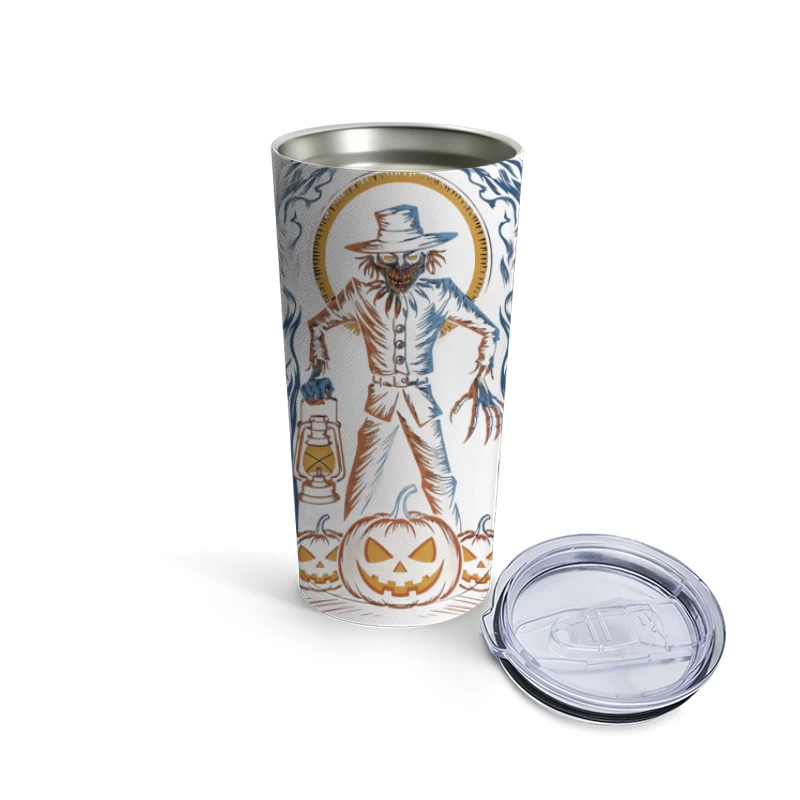 Whimsical Halloween Cat in Striped Pajamas with Jack-o'-Lantern Travel Mug