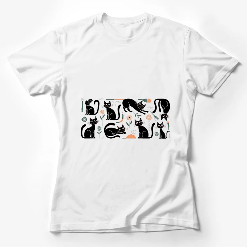 Playful Black Cats Geometric Illustration with Floral Elements Female T-Shirt