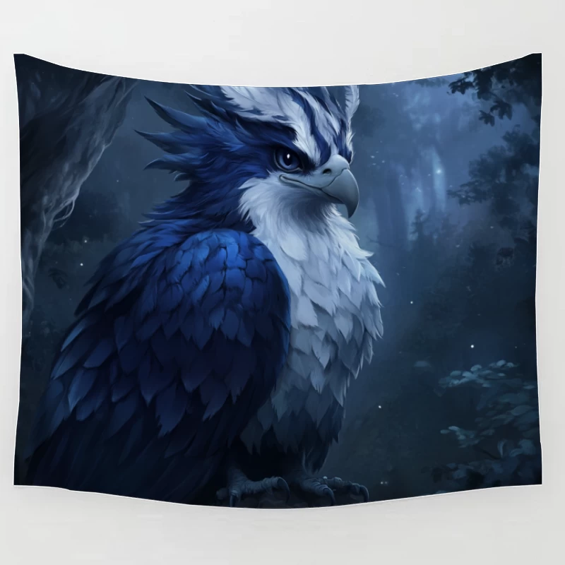 Majestic Blue Phoenix in Enchanted Midnight Forest Tapestry