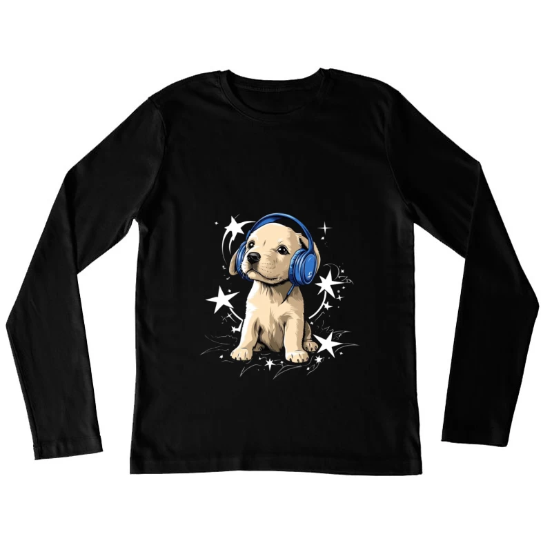 Adorable Cartoon Puppy Wearing Blue Headphones Female Long Sleeve T-Shirt