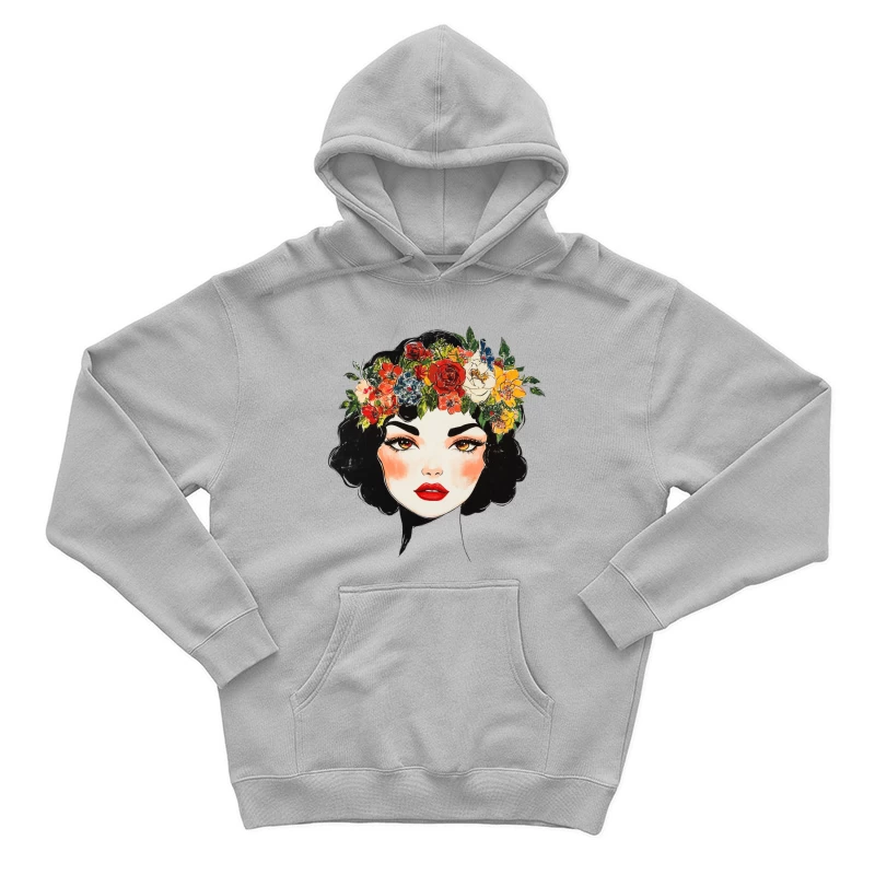Colorful Floral Crown Illustration: Vibrant Portrait with Dark Hair and Red Lips Female Pullover Hoodie