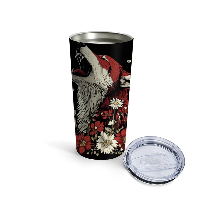 Howling Wolf Amidst Blooming Flowers: A Striking Illustration Travel Mug