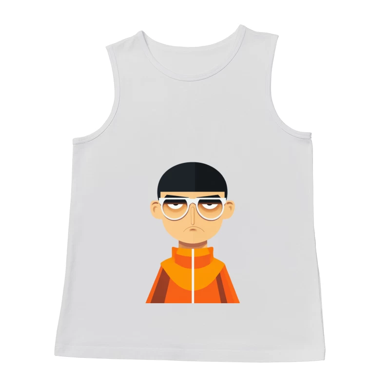 Grumpy Cartoon Character with Glasses in Orange Jacket Male Tank Top