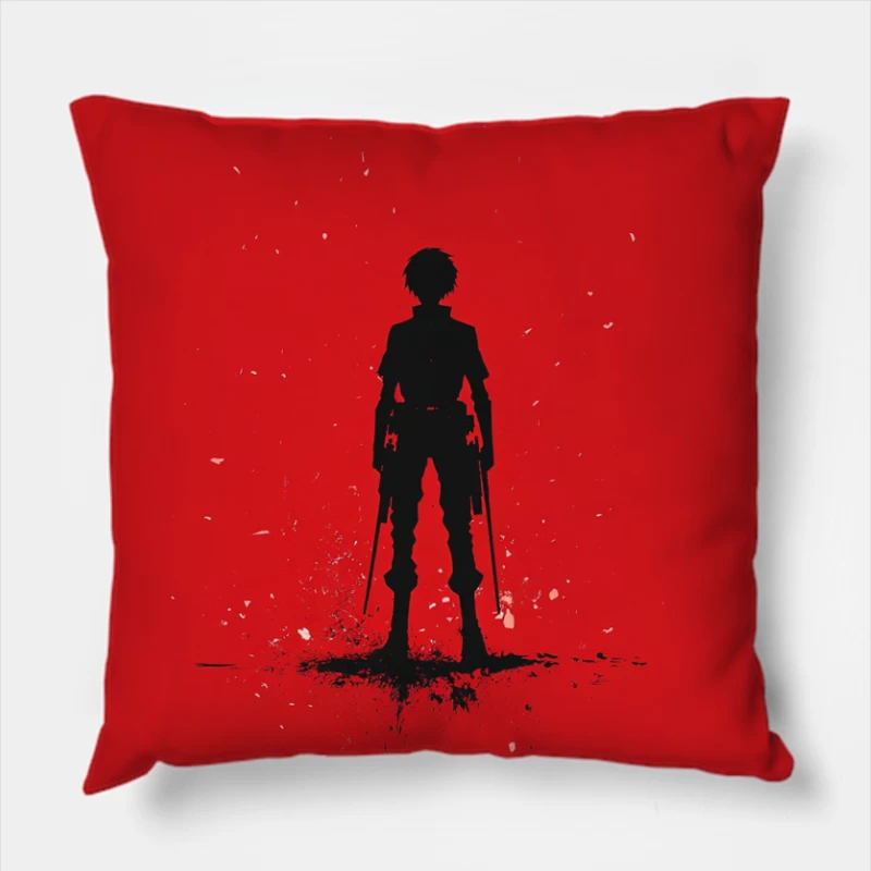 Ominous Silhouette: Lone Armed Figure on Red Throw Pillow