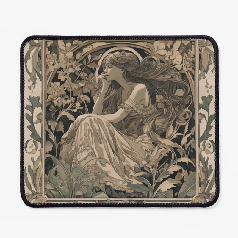 Art Nouveau Floral Portrait: Ornate Monochrome Illustration Mouse Pad