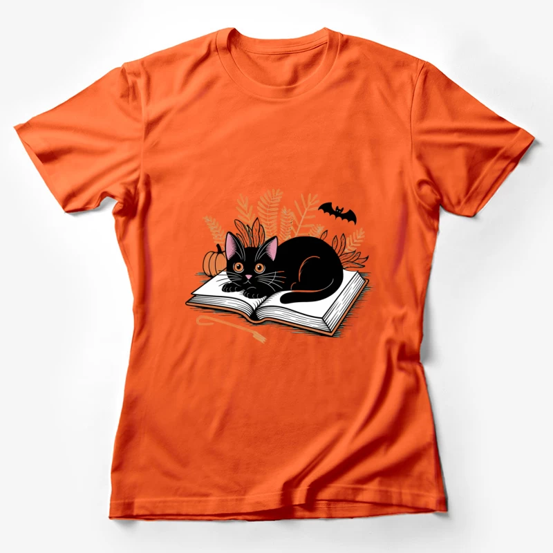Cozy Halloween Reading: Black Cat on Book with Autumn Decor Female T-Shirt