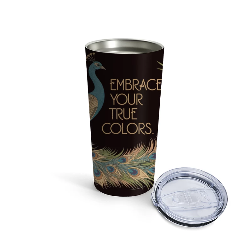 Colorful Peacock Illustration with Inspiring Quote Travel Mug