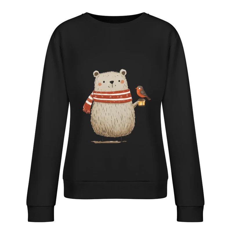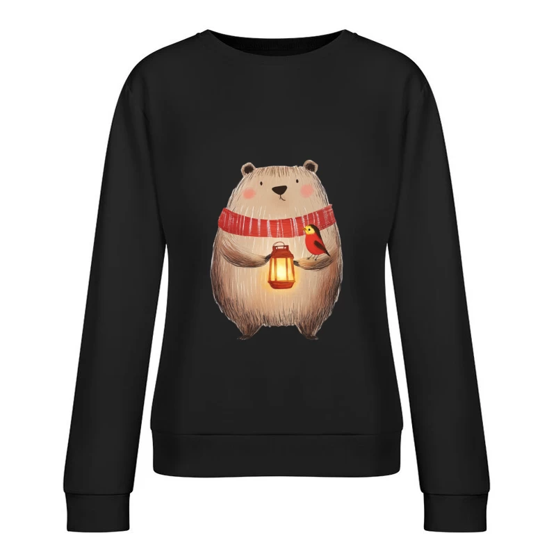 Cute Illustrated Bear with Winter Scarf and Bird Friend Holding Lantern Female Pullover Sweatshirt