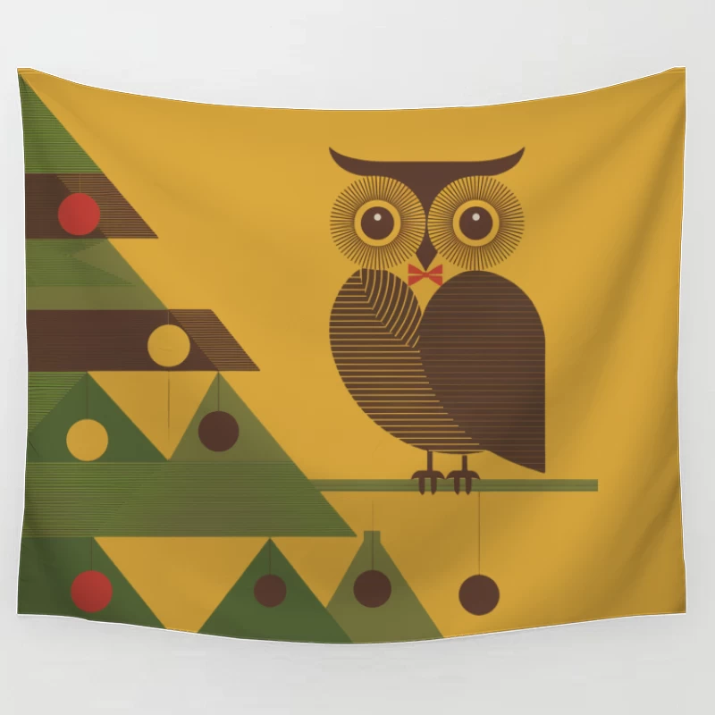 Retro Geometric Owl with Christmas Tree Illustration Tapestry