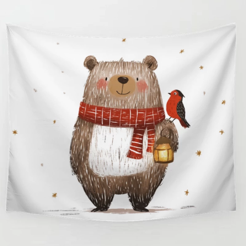 Whimsical Winter Bear with Lantern and Red Bird Tapestry