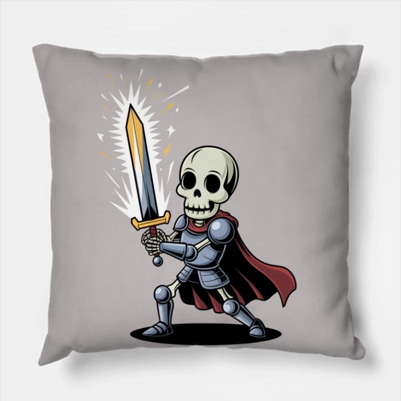 Cartoon Skeleton Knight with Sword and Red Cape Throw Pillow