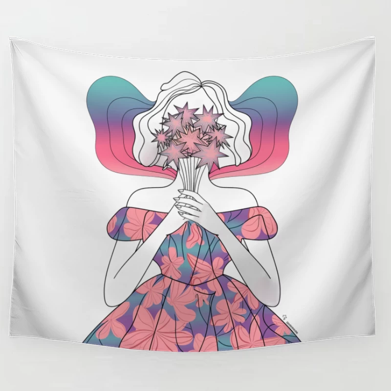 Surreal Feminine Illustration with Floral Dress and Stargazer Lilies Tapestry
