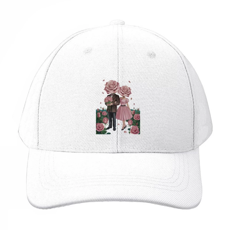 Surreal Rose-Headed Couple in Vintage Attire Amidst Romantic Flower Field Baseball Cap