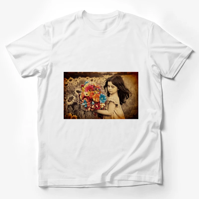 Dreamy Portrait of Girl with Colorful Bouquet in Sunflower Field Male T-Shirt